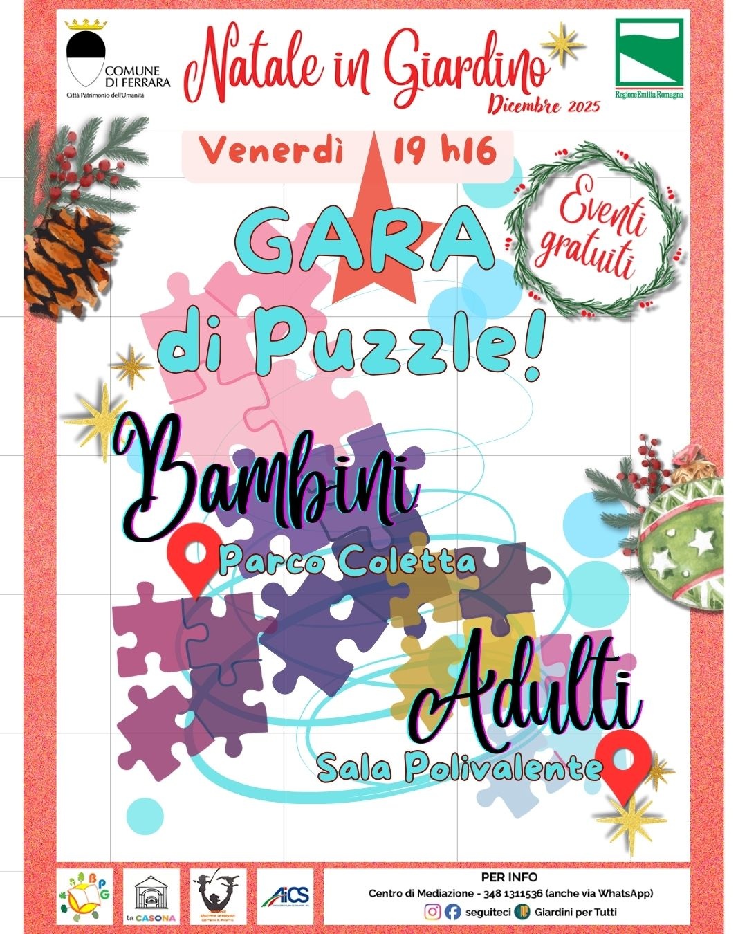 Venerdì 19 dicembre appuntamento con una gara di puzzle alle ore 16 alla Sala Polivalente e al parco Coletta. Una sfida per appassionati dove le squadre di partecipanti gareggiano contro il tempo per assemblare un puzzle il più velocemente possibile. Si possono iscrivere singole persone o gruppi composti da un massimo di 4 persone, senza limiti di età.